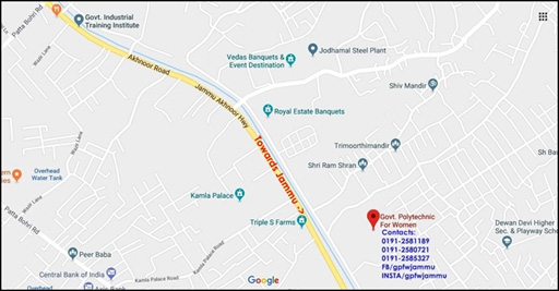 Location: The Polytechnic is situated at Lower Shiv Nagar which is 2 K.Ms from Jewel Chowk the main City Center of Jammu. Jammu is the Winter capital of Jammu & Kashmir state and is connected by Road, Rail and Air Transport. The Railway Station is 12 KMs away from the Institute & Airport is 10 KMs away.