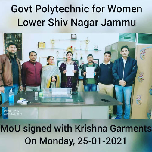 MoU signed on 26-01-2021 between Govt Polytechnic for Women Jammu and M/S Krishna Garment Industries for a period of three years.