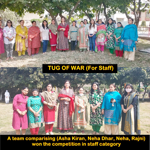 - A team comparising Asha Kiran, Neha Dhar, Neha & Rajni won the "Tug of War' competition in staff category.