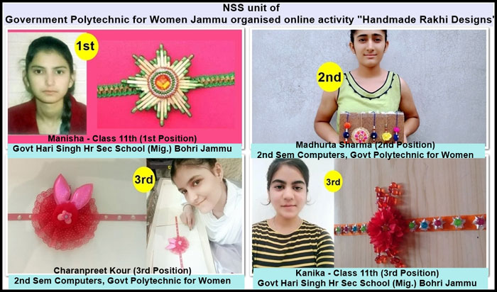 The season of festivals is here. India is celebrating Raksha Bandhan 2021 also known as Rakhi. The day is dedicated to the bond between brothers and sisters. NSS unit of Government Polytechnic for Women Jammu organised an open online competition "Home-made Rakhi Designs", where students were asked to share their one minute video designing Rakhi at home. Students from different schools and colleges participated in the online event. Manisha of Class-11th from Government Hari Singh Hr Sec School (Migrant) Bohri Jammu won the competition. Madhurta Sharma, a student of 2nd semester Computer Engineering Department of this institution is remained at 2nd position, where as 3rd position is shared between Kanika (a student of Class-11th of Government Hari Singh Hr Sec School (Migrant) Bohri Jammu) and Charanpreet Kour (Student of 2nd semester Computer Engg Deptt). Ms. Bhavana Arora (NSS Program Officer) coordinated the event.
